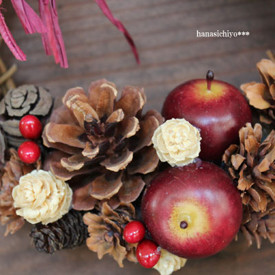 フェイクのリンゴと木の実がいっぱい!! これからの季節にぴったりの、ほっこり色♪